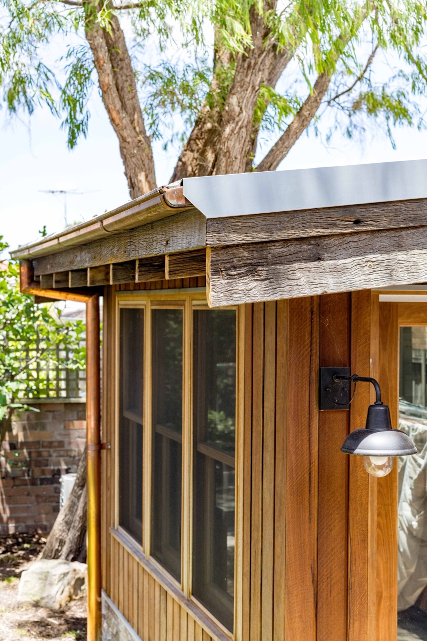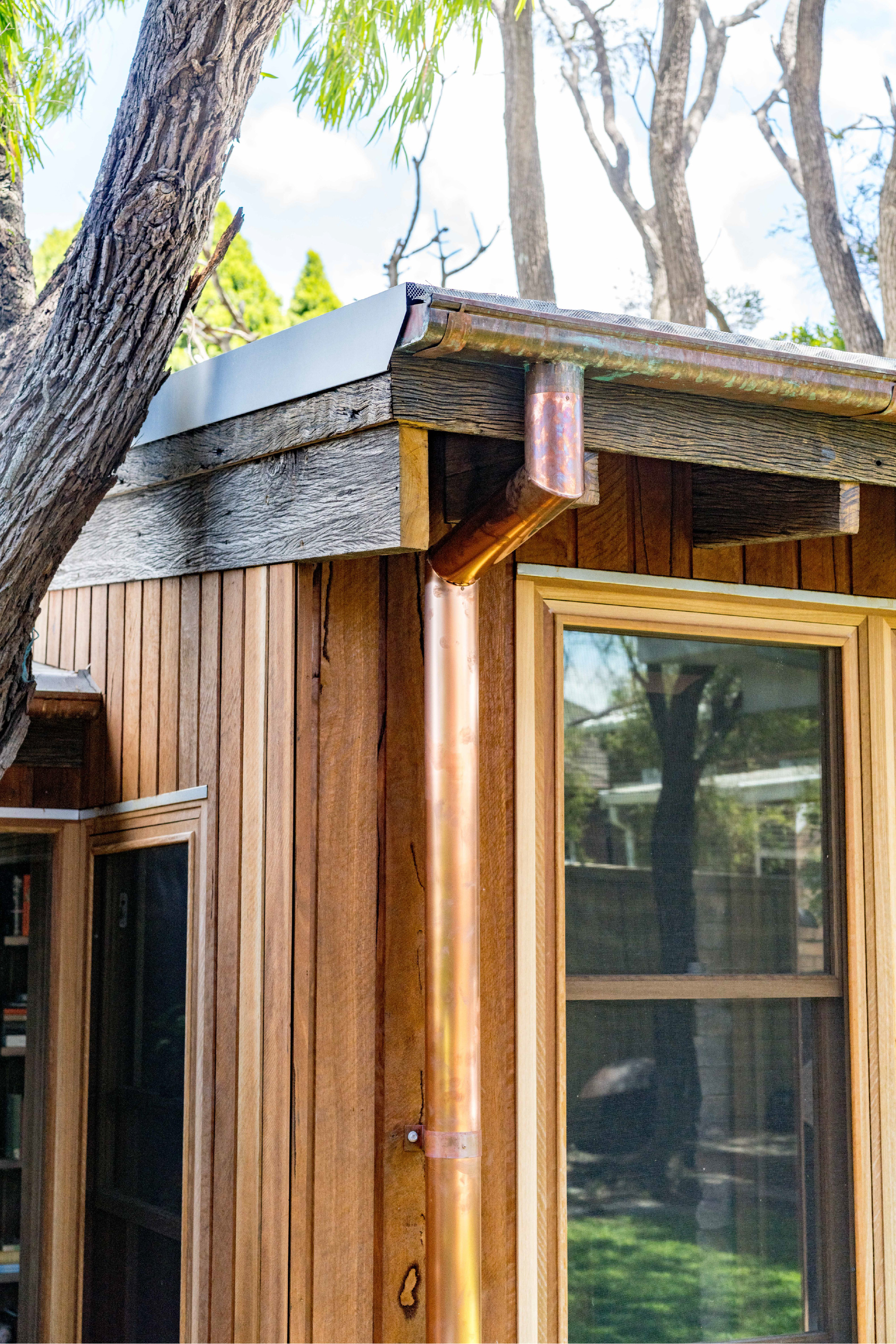This home office addition project involved the installation of custom copper downpipes, rain heads, and architectural detailing to complement the natural timber exterior and corrugated roofing. The goal was to create a premium finish that not only performs exceptionally in managing rainwater but also enhances the visual appeal of the structure. The result is a refined, high-end finish that will continue to develop a rich patina over time.